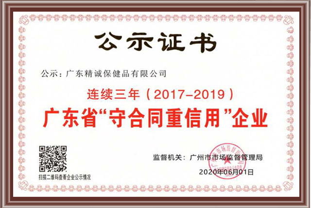 广东省市场监督管理局连续3年授予广东精诚保健品有限公司:守合同重信用企业